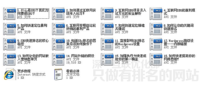 本套深一SEO視頻培訓(xùn)課程包括20部高清視頻+清晰語音+整齊的文本條目,手把手教會(huì)快速從主流搜索引擎上獲得排名,從而獲得無限網(wǎng)絡(luò)商機(jī)。